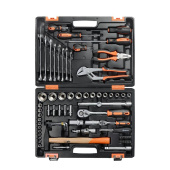 Для слесарных работ в комплекте имеются пассатижи и клещи, а также молоток. Кейс выполнен из пластика, оснащен раздельными петлями и двумя металлическими замками для безопасной транспортировки.
