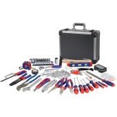 • по 1 шт. универсальный нож, плоскогубцы 180 мм, бокорезы, длинногубцы, разводной ключ, клещи переставные 240 мм, напильник плоский 200 мм, клещи обжимные 200 мм, тестер напряжения 100-250 В, трещотка 3/8″, вороток 1/4″ 110 мм, удлинитель 3/8″ 150 мм, свечная головка 3/8″ 21 мм, адаптер для бит 1/4″ CR-V, торцевой переходник 3/8″ — 1/4″, ножовка по металлу, полотно по металлу 250 мм. 24TPI, уровень пластиковый 225 мм, рулетка 5 м, молоток 300 гр., Изоляционная лента, битодержатель 1/4″ CR-V