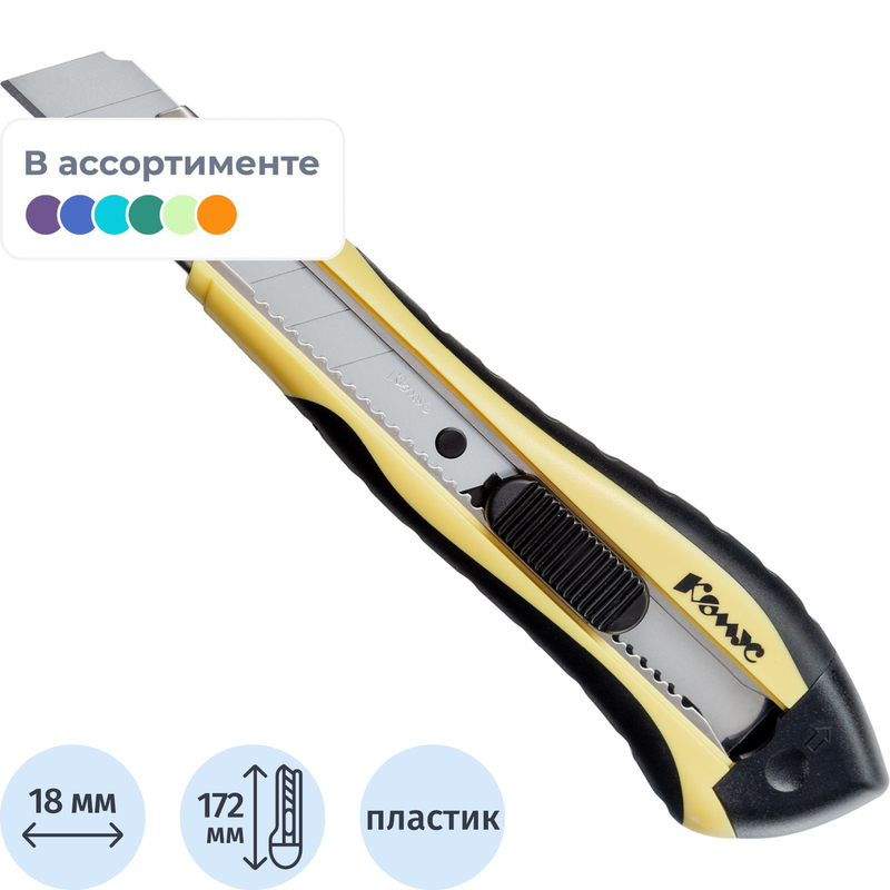 Нож канцелярский Комус с металлическими направляющими и роликовым фиксатором (ширина лезвия 18 мм)