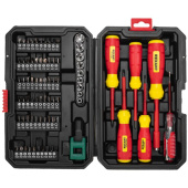 Набор отвёрток Rexant с битами и торцевыми головками (76 штук, 12-4771-3) Набор отвёрток Rexant предназначен для электромонтажных работ, монтажа/демонтажа крепёжных соединений: шурупов, саморезов и т. д. Диэлектрические стержни отвёрток и биты, изготовленные из высококачественной хромованадиевой стали, покрыты специальным изоляционным материалом и обладают оксидированными намагниченными наконечниками. Корпус эргономичной изолированной рукоятки выполнен из пластика, не скользит в ладони, что обеспечивает дополнительный комфорт при работе. Набор поставляется в пластиковом боксе для удобства хранения и транспортировки. Материал стержней — хромованадиевая сталь. Материал рукоятки — ABS-пластик. Материал бокса — ABS-пластик. Набор состоит из 76 предметов: • биты крестовые: РН0×2, РН1×2, РН2×2, PH3×4, PZ1, PZ2, PZ3; • U-образные: U6, U8, U10, U12; • шестигранные: Н2,5, НЗ, Н4, Н5, Н6; • квадратные: SQ1, SQ2, SQ3; • tri-wing (трехлистник): Y1, Y2, Y3, Y4; • DR: #1, #2, #3; • треугольник: 2,3, 2,6, 3,0; X: 6, 8,10; • шлицевые: SL3×2, SL4×2, SL5×2, SL6×2, SL7×2; • шестигранная звезда (с отверстием): Т8Н, Т10Н, Т15Н, Т20Н, Т25Н, Т27Н, ТЗОН, Т35Н, Т40Н; • головки мини: М5, М6; • головки: М5, М6, М7, М8, М9, М10, М11, М12, М13; • отвёртки: РН0×75, РН1×75, SL3×75, PH/SL2×75; • отвёртка под биты; • переходник; • тестер-отвертка, • намагничиватель. Внешний вид и/или характеристики товара могут быть изменены производителем в соответствии с производственным процессом.
