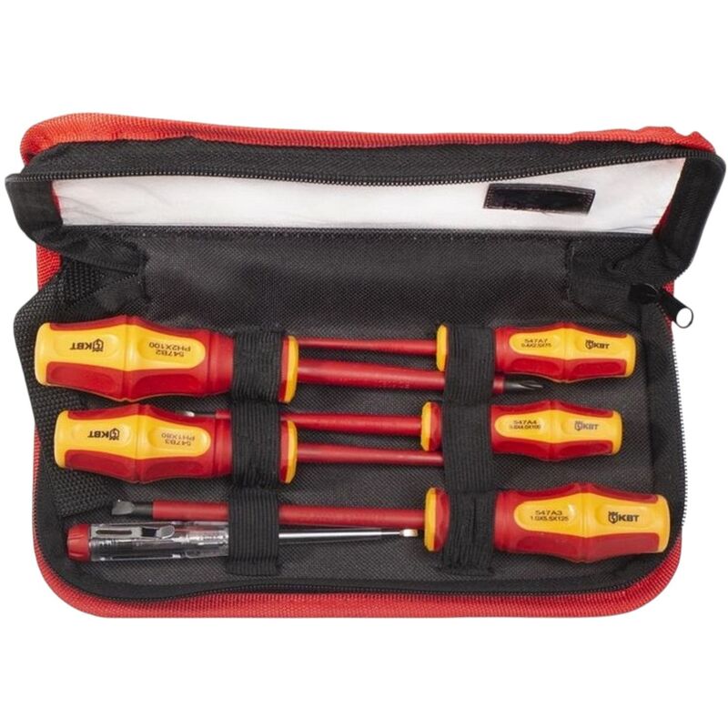 Набор отвёрток КВТ Профи НИО-06 (6 штук, 78617). Для работ под напряжением до 1000 В. Особенности: Двухкомпонентные эргономичные рукоятки с мягкими прорезиненными вставками; Маркировка на торце рукояток с обозначением типа профилей; Специальная форма рукояток, не позволяющая инструменту скатываться с наклонной поверхности; Стержни из хром-ванадиевой стали; Намагниченные вороненые наконечники. Комплектация: — Отвёртка шлиц 2.5×75. — Отвёртка шлиц 4×100. — Отвёртка шлиц 5.5×125. — Отвёртка PH1×80. Отвёртка PH2×100. — Отвёртка-индикатор. — Кофр. Вес набора: 416 г. Внешний вид и/или характеристики товара могут быть изменены производителем в соответствии с производственным процессом.
