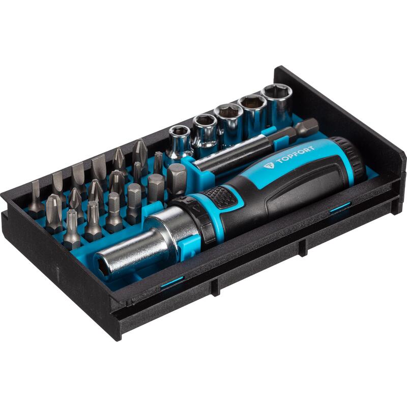 Отвертка реверсивная с набором бит Topfort 25 шт. для работы с крепежными изделиями резьбовых соединений, для закручивания и выкручивания винтов, болтов и других видов крепежного элемента. Особенности изделия: — Материал бит и торцевых головок — высокопрочная хромованадиевая сталь специальной закалки. — Эргономичная двухкомпонентная рукоятка с вставками из термопластичного каучука (TPR вставка) снижает нагрузку на кисть и способствует крепкому захвату инструмента. — Магнитный держатель обеспечивает быструю и надежную замену насадок. — Отвертка оснащена реверсивным храповым механизмом. В комплект входит 25 предметов: — Реверсивная отверточная рукоятка с храповым механизмом — 1шт. — Магнитный держатель для бит — 1 шт. — Переходник — 1 шт. — Переходник, длина — 100 мм — 1 шт. — Универсальное соединение — 1 шт. — Металлические биты (6.35×25 мм): плоские (3 мм, 4 мм, 5 мм, 6 мм); крестообразные (PH1, PH2, PH3, PZ1, PZ2, PZ3); шестигранные (T10, T15, T20, T25, H4, H5, H6). — Торцевые шестигранные головки ¼« — 5 шт.: 5 мм, 6 мм, 7 мм, 8 мм, 9 мм. Внешний вид и/или характеристики товара могут быть изменены производителем в соответствии с производственным процессом.