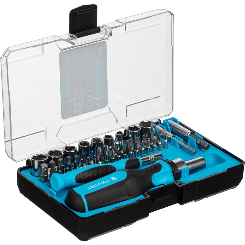 Отвертка реверсивная с набором бит Topfort 49 шт. для работы с крепежными изделиями резьбовых соединений, для закручивания и выкручивания винтов, болтов и других видов крепежного элемента. Особенности изделия: 1. Материал бит и торцевых головок — высокопрочная хромованадиевая сталь специальной закалки. 2. Эргономичная двухкомпонентная рукоятка с вставками из термопластичного каучука (TPR вставка) снижает нагрузку на кисть и способствует крепкому захвату инструмента. 3. Магнитный держатель обеспечивает быструю и надежную замену насадок. 4. Отвертка оснащена реверсивным храповым механизмом. В комплект входит 49 предметов: • Реверсивная отверточная рукоятка с храповым механизмом — 1шт. • Отверточная рукоятка — 1шт. • Магнитный держатель — 1 шт. • Магнитный держатель для точных работ — 1 шт. • Переходник, длина — 25 мм — 1 шт. • Металлические биты для точных работ — 20 шт. (4×28 мм): — Плоские: 1.0 мм, 1.5 мм, 2.0 мм, 2.5 мм; — Крестообразные: PH000, PH00×2, PH0×2, PH1×2; — Шестигранные: T4, T5, T6, T7, T8, T9, H2.0, H2.5, H3.0. • Металлические биты — 15 шт. (6,35×25 мм): — Плоские: 3 мм, 4 мм, 5 мм, 6 мм, 7 мм; — Крестообразные: PH0, PH1, PH2, PH3; — Шестигранные: T10, T15, T20, T25, T27, T30. • Торцевые шестигранные головки 1/4″ — 9 шт.: 5 мм, 6 мм, 7 мм, 8 мм, 9 мм, 10 мм, 11 мм, 12 мм, 13 мм. Внешний вид и/или характеристики товара могут быть изменены производителем в соответствии с производственным процессом.