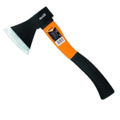 и т. д. Благодаря углу заточки рабочей кромки 20–30 градусов полотно легко врезается в древесину, поэтому топором комфортно работать. ПреимуществаПолотно выполнено из стали 45, которая гарантирует его надежность и долговечность при непрофессиональном применении. Прочность полотна достигается за счет его закалки до твердости 35–40 HRC на высоту до 25 мм от режущей кромки. Фибергласовая рукоятка прослужит долгое время,т. к. не разрушается от воздействия окружающей среды. Обрезиненное топорище с изгибом надежно лежит в руке и не проскальзывает. Вес полотна составляет 600 г, поэтому топор не оказывает большой нагрузки на руки. Топор с небольшой рукояткой 385 мм легко поместится в переноску для инструмента или рюкзак. КомплектацияТопор;Упаковка.