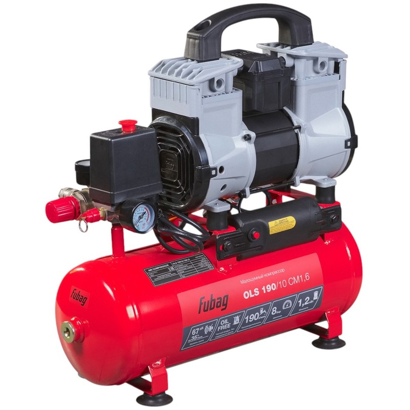 Компрессор безмасляный малошумный Fubag OLS 190/10 CM1.6 (646066) Компрессоры серии OLS — безмасляные малошумные машины, предназначенные для снабжения пневмоинструмента чистым, без примесей масла, воздухом. Идеальны для использования при проведении окрасочных работ, в автосервисах, небольших мастерских. Специальная конструкция воздушной головки позволяет более чем на 30% снизить уровень шума по сравнению с коаксиальными поршневыми аналогами, обеспечивает низкую вибрацию и высокий рабочий ресурс. Компрессор работает в режиме S1 — непрерывно, без требований цикличности нагрузки. Отсутствие масла позволяет легко транспортировать компрессор в любом пространственном положении без риска протечек. Сбалансированное расположение блока цилиндров на валу электродвигателя: — повышает производительность компрессора; — снижает рабочую температуру воздушной головки; — уменьшает уровень шума более чем на 30% по сравнению с поршневыми компрессорами прямого привода классической компоновки. Внешний вид и/или характеристики товара могут быть изменены производителем в соответствии с производственным процессом.