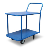 Платформенная двухъярусная 4-х колесная тележка КП-2 (2-х ярусная) используется для перевозки малогабаритных грузов. Платформы имеют металлический каркас накрытый металлическим листом толщиной 1,2 мм. Размер платформы 700х1200 мм. Расстояние между ярусами 480 мм Количество ярусов - два.Габаритная высота 1050 ммПокрытие металлических деталей тележки - полимерное. Цвет - синий.Тележка КП-2 (2-х ярусная) оснащена двумя поворотными и двумя неповоротными колесами, изготовленными из высококачественной литой резины, диаметром 160 мм, комплектом крепежа. Две платформы позволяют удобно расположить перевозимые предметы.Тележка широко используется на складах, в торговых павильонах, а также в гостиничном и ресторанном бизнесе. Грузоподьемность до 400 кг.