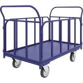 Тележка металлическая платформенная с быстросъемными трубчатыми бортами, служит для транспортировки товаров в мелких и крупных логистических центрах. Высокие борта (500 мм.) и наличие двух ручек делают телегу удобнее в эксплуатации, ее можно использовать по принципу «тяни-толкай» . На бортах установлены быстросъемные элементы, которые без применения инструмента позволяют быстро установить борты, а если они не нужны — снять их. Наличие пружинных кронштейнов на бортах позволяет жестко пристегнуть быстросъемный борт к платформе тележки. В комплект поставки входит группа метизов для установки платформенных колес и ручек. Полимерная порошковая окраска позволяет работать на открытом воздухе при атмосферных осадках.