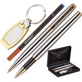 Комплектация: шариковая ручка, роллер, брелок, подарочный футляр.