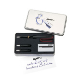 Комплектация: Подарочная жестяная коробка, перьевая черная ручка c пером 1.5 мм, сменные пишущие узлы с перьями 1.1 и 1.9 мм, упаковка из 5-ти чернильных картриджей черного цвета Lamy T10, 2 колпачка-заглушки для пишущих узлов, инструкция. -