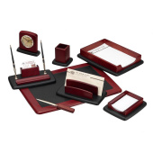 Офисный набор состоит из дерева (красное дерево). В набор входит 8 предметов: коврик на стол, подставка для ручек (2 шариковые ручки в комплекте), держатель для заметок, держатель для писем, подставка для карандашей, нож для вскрытия писем, лоток для бумаг, часы настольные.