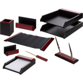 Комплектация: коврик настольный (дерево, МДФ, ПВХ), подставка-держатель для ручек (дерево, МДФ, металл, пластик), подставка для бумаг для заметок (дерево, МДФ), подставка для визиток (дерево, МДФ), подставка для писем (дерево, МДФ), подставка для ручек и карандашей (дерево, МДФ), ножичек канцелярский для вскрытия конвертов (дерево, металл), лоток для бумаг двухъярусный (дерево, МДФ, металл), ручка шариковая (2 штуки).