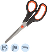 Ножницы для правшей Выбор есть 200 мм пластиковые ручки с резиновыми вставками красного и черного цвета. Универсальные ножницы Выбор есть — это практичный инструмент для решения множества бытовых задач. Особенности изделия: оптимальная длина 200 миллиметров — удобны для большинства видов работ. Универсальность: подходят для резки бумаги, картона, ткани, нитей и других материалов. Прочные лезвия изготовлены из нержавеющей стали, что обеспечивает долговечность и стойкость к коррозии. Двухсторонняя заточка обеспечивает аккуратный и ровный рез. Безопасность: тупоконечные лезвия снижают риск травмирования. Пластиковые ручки красного и черного цветов обеспечивают комфортный хват. Ножницы Выбор есть — надежный помощник дома и в офисе!