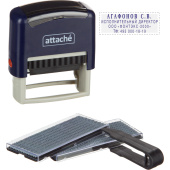 Штамп самонаборный Attache предназначен для самостоятельного создания и изменения текста оттиска. Компактный и надежный пластиковый корпус с автоматическим поворотным окрашивающим механизмом. Легкая и чистая замена штемпельной подушки. Оптимальный набор букв, цифр и символов. Размер оттиска — 48×18 мм. Максимальное количество строк: 4. Максимальное количество знаков в каждой строке — 24 основным шрифтом. Максимальное количество знаков: 96. Комплектация: штамп с рифленой пластиной для набора.