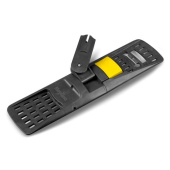 Раскладывание держателя для надевания/смены текстильной насадки (мопа) осуществляется нажатием на однукнопку-защелку . Фиксация держателя в рабочем положении обеспечивается этой жекнопкой-защелкой при нажатии рукояткой на держатель, расположенный рабочей плоскостью на полу или другой поверхности. Держатель крепится к рукоятке с помощью шарнира, обеспечивающего высокую степень подвижности при работе. Все элементы держателя обладают высокой прочностью и изготовлены из материалов, отличающихся устойчивостью к коррозии, что позволяет использовать при уборке любые доступные моющие средства.