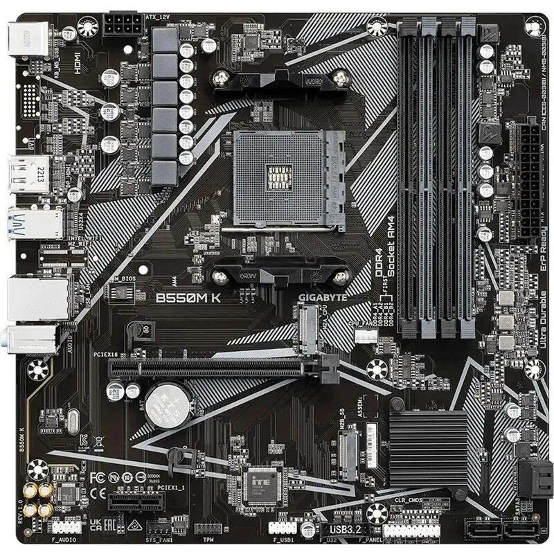 Материнская плата Gigabyte B550M K обладает свойствами производительной и надежной основы для универсального системного блока. Она выполнена в компактном форм-факторе Micro-ATX и поддерживает работу с процессором AMD (разъем подключения AM4). Для подключения графического адаптера, модулей оперативной памяти и накопителей предусмотрены разъемы PCI-Ex16, DIMM DDR4, M.2 и SATA. Gigabyte B550M K оборудована сетевым адаптером со скоростью 1 Гбит/с. Для периферийных устройств есть порты USB, видеовыходы DisplayPort и HDMI, разъемы аудио. Надежная элементная база с протестированными компонентами гарантирует исключительную стабильность, а фирменные утилиты помогают контролировать параметры и осуществлять их настройку.