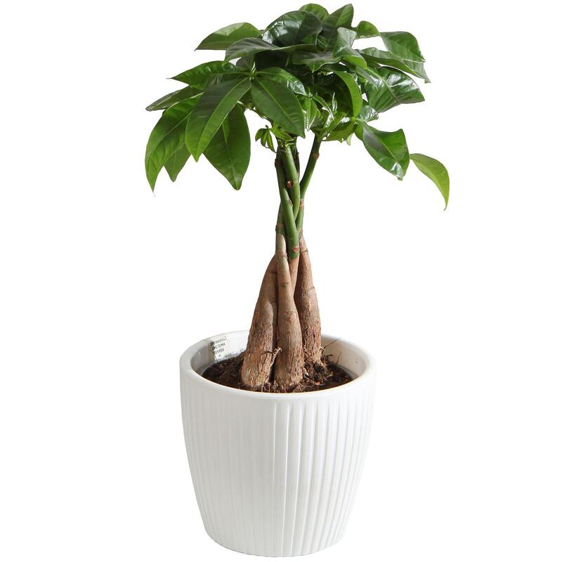 Растение Пахира Акватика Дерево Счастья в круглом кашпо белого цвета (40-50 см)