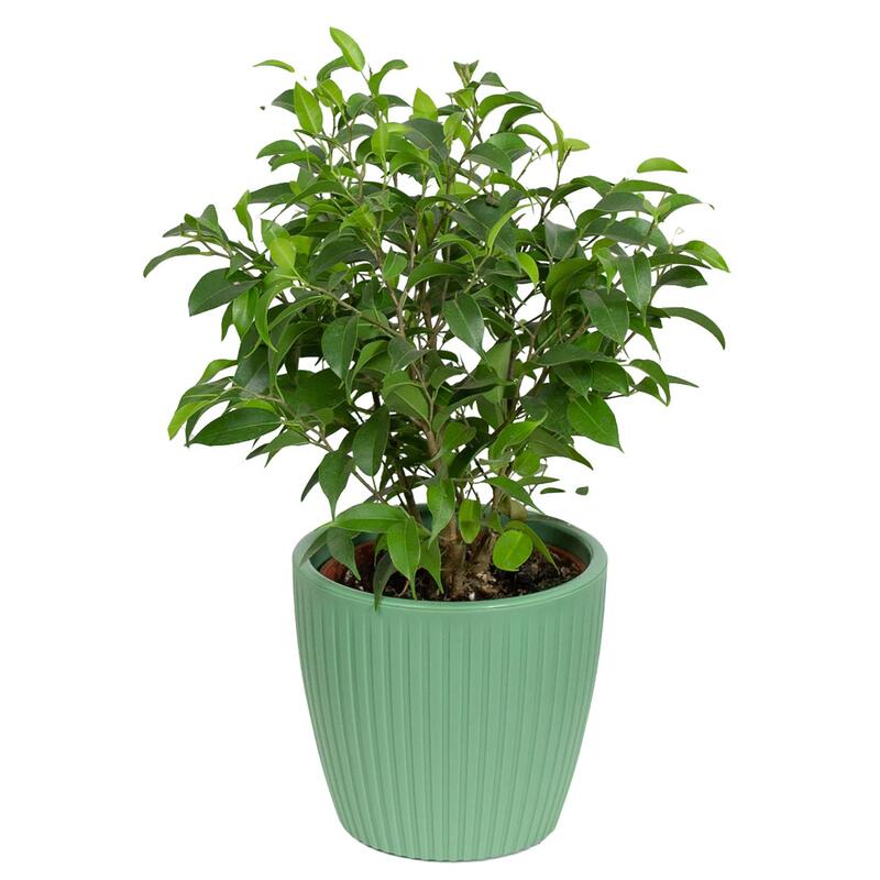 Растение Фикус бенджамина Наташа в круглом кашпо зеленого цвета (25-35 см)