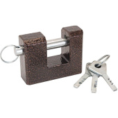 Замок навесной с прямой дужкой. Материал корпуса — алюминиевый сплав, полимерное покрытие. Стальная закаленная дужка. Размер (ШхГхВ): 86×29×60 мм, диаметр дужки — 12 мм. Комплектуется 3 ключами. Прямая дужка и корпус, надежно защищающий дужку от перепиливания и взлома ломом. -