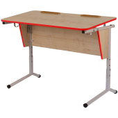 Стол ученический двухместный регулируемый СУ-5Р с наклоном столешницы — предназначен для оборудования учебных заведений. Имеет регулировку высоты от 5-ой до 7-ой ростовой группы и углу наклона столешницы 0-30°С. С внешних сторон стола расположены удобные безопасные крючки. Столешница снабжена лотком для письменных принадлежностей Каркас стола изготовлен из двух видов мебельной трубы плоскоовального сечения — 45×25 мм и 50×30 мм, покрашен полимерной порошковой краской. Стандартный цвет каркаса — серый. Материал столешницы и задней стенки — ЛДСП, толщиной 16 мм. Варианты кромки столешницы — ПВХ 0,4 мм и ПВХ 2 мм, цвет — красный. Допускаемая нагрузка на стол не более 70 кг. Изделие спроектировано и изготовлено в соответствии с требованиями ГОСТ и Санитарной службы РФ.