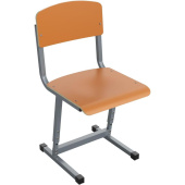 Стул. Сиденье и спинка стула изготовлены из гнутоклееной фанеры толщиной не менее 8 мм, покрытой цветным декоративным пластиком. Крепление сиденья и спинки к каркасу стула осуществляется при помощи мебельных болтов и гаек. Две боковины стула разборные, с регулировкой высоты, выполнены из профиля квадратного сечения 25×25 мм и 20×20 мм с толщиной стенок не менее 1,2 мм. Регулировка высоты осуществляется с помощью винтовых соединений с гайкой Эриксона. Стойки стула наклонены вперед на 10 градусов, а спинка имеет угол наклона 95 градусов. Связь выполнена из профиля прямоугольного сечения 25×40 мм с толщиной стенок не менее 1,2 мм и крепится к стойкам стула на 4 болта с гайками Эриксона. Металлокаркас покрыт порошковой краской, стойкой к химическим и механическим воздействиям. На свободных концах труб установлены заглушки из ударопрочных полимеров. Каркас стула имеет полимерные подпятники, предотвращающие повреждение напольного покрытия. Стул имеет цветовую маркировку в соответствии с ростовыми группами.