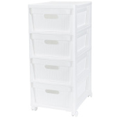 Комод на колесах решит проблему организации вещей в гостиной, ванной, детской, гардеробе и даже на кухне. Ширина 300 мм идеальна для узких пространств. Имеет 4 вместительных съемных ящика по 13 литров. Сзади имеется ограничитель для фиксации ящиков. Удобные ручки. Колеса вращаются на 360 градусов — легкий комод удобно возить. Верхняя плоскость может использоваться как полочка. Прост в уходе — достаточно протереть влажной тканью. Поставляется в индивидуальной коробке в разобранном виде. Инструкция в комплекте. Легко собирается. -