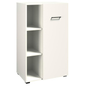 Шкаф средний полузакрытый с полками, с асимметричными открытыми полками и одним распашным фасадом, ручка металлическая L128 черного цвета, ножки с регулировкой по высоте укомплектованы прокладками самоклеящимися войлочными. Задняя стенка HDF 3 мм, все детали мебели ЛДСП 16 мм, кромка ПВХ 1 мм, фактически видимые части деталей — 1 мм, а остальное бумажная кромка 0,5 мм.