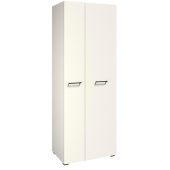 Шкаф высокий закрытый с полками, с двумя асимметричными распашными фасадами, ручка металлическая L128 черного цвета, ножки с регулировкой по высоте укомплектованы прокладками самоклеящимися войлочными. Задняя стенка HDF 3 мм, все детали мебели ЛДСП 16 мм, кромка ПВХ 1 мм, фактически видимые части деталей — 1 мм, а остальное бумажная кромка 0,5 мм.