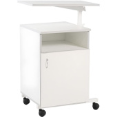 Тумба изготовлена из ЛДСП толщиной 16 мм. Все кромки облицованы кромочной лентой ПВХ. Тумба имеет открытую нишу, нижнее отделение с дверкой и поворотный столик. Столешница поворотного столика изготовлена из ЛДСП. Каркас столика изготовлен из стального профиля. Не обладает влагостойким покрытием. Не подвергайте поверхности изделия длительным воздействиям влаги. Это может привести к набуханию плит и потере целостности изделия, что не будет рассматриваться как гарантийный случай. Телескопическое устройство позволяет фиксировать столешницу столика на высоте от 800 до 1100 мм. Установлена на мебельные колеса ∅50 мм. Возможна комплектация регулируемыми опорами.