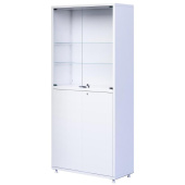Шкаф медицинский предназначен для размещения и хранения лекарственных средств, перевязочных материалов, инструментов, медицинских расходных материалов и других изделий медицинского назначения. Шкаф медицинский является необходимой частью оснащения смотровых, процедурных, перевязочных кабинетов, постов медицинских сестер, реанимационных палат и операционных блоков лечебно-профилактических учреждений. Производится по единой технологии в виде жесткой двух-объемной модульной сборно-разборной конструкции, которая состоит из металлических панелей, изготовленных из листовой углеродистой стали, составляющих каркас (стенки и короба) шкафов, а также дверей и полок. Верхняя секция имеет две стеклянные двери, укомплектованные магнитными защелками. Петли для стеклянных дверей вставляются в отверстия в горизонтальных коробах при сборке шкафа, а наличие втулок из ПВХ исключает люфт и смягчают работу дверей. Две стеклянные полки устанавливаются на удобную для эксплуатации высоту. Нижняя секция имеет две двери металлические с вертикальным П-образным усилителем, придающим им жесткость. Оси дверей вставляются в отверстия в горизонтальных коробах при сборке шкафа, а наличие втулок из ПВХ исключает люфт и смягчают работу дверей. Правая дверь снабжена врезным мебельным замком с комплектом ключей, левая — магнитной защелкой. Две полки металлические устанавливаются на удобную для эксплуатации высоту. Полки металлические и стеклянные устанавливаются на универсальные металлические пластинчатые полкодержатели. Шаг отверстий для установки полкодержателей — 120 мм, в верхней секции предусмотрено пять уровней высоты для полок, в нижней секции — четыре уровня. Покрытие всех металлических деталей шкафа выполнено экологически чистой эпоксидной полимерно-порошковой краской, устойчивой к ударам, сколам и регулярной обработке всеми видами медицинских моющих и дезинфицирующих растворов. Двери открываются и закрываются свободно, без заедания и перекосов. Поставляется в разобранном виде и собирается на винтах без применения специального инструмента. Товар имеет регистрационное удостоверение Росздравнадзора на медицинское изделие. Не облагается НДС.