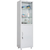 Шкаф медицинский предназначен для хранения медикаментов, инструмента, перевязочного материала. Изготавливается из высококачественной стали. Шкаф состоит из двух отделений. Верхнее отделение шкафа имеет стеклянную дверцу и полки. Хромированные магнитные защелки фиксируют стеклянную дверь в закрытом состоянии. Нижнее отделение имеет металлическую дверцу и полки. Нижняя дверца запирается на замок. Комплектуется ключевым замком Практик (1000 комбинаций). Регулируемые опоры позволяют устанавливать шкаф на любой вид пола. Покрытие медицинского шкафа гигиенически безопасное, коррозийно-устойчивое. Тип материала корпуса — сталь толщиной 0.6 мм. Тип материала двери нижнего отделения — металл толщиной 0.7 мм. Тип материала двери верхнего отделения — стекло толщиной 4 мм. Количество замков — 1 штука. Количество полок — 4 штуки (2 металл/2 стекло). Нагрузка на металлическую полку — 30 кг. Нагрузка на стеклянную полку — 10 кг. Количество дверей — 2 штуки. Тип покрытия — порошковое, цвет белый. Шкаф поставляется в разобранном виде. В комплекте 4 регулируемые опоры.