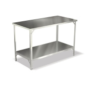 Столы производственные имеют широкую область применения: в пищеблоках, продовольственных магазинах, в цехах, связанных с переработкой пищевого сырья и т.д. Данный стол производственный имеет разборную конструкцию. Он состоит из столешницы, изготовленной из пищевой нержавеющей стали AISI 430 и каркаса, изготовленного из оцинкованного металла, и полки. Столы без борта устанавливаются в центре кухонного помещения и предназначены для четырёхстороннего доступа к рабочей поверхности.