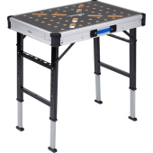 Внимание! Пожалуйста, проверяйте цвет изделия до начала сборки! Цвет на изображении товара в интернет-магазине или в печатном каталоге может отличаться от оригинала из-за особенностей цветопередачи. Верстак слесарный Стелла-техник ST-058 (чёрный, 845×598×885 мм) — это универсальный складной рабочий стол, который можно использовать как в качестве верстака, так и в качестве строительных козлов. Опорная конструкция верстака разработана специально под вес до 250кг. Для этого опорные ноги изготовлены из трубы сечением 40×20мм, толщина металла 1,5мм. Столешница — ламинированный МДФ, толщина 18мм. На столешнице предусмотрена перфорация и специальные упоры для надёжной фиксации обрабатываемых деталей. А для точности обработки заготовок нанесена линейка с двух сторон. Также в комплекте идут струбцины с рабочей длиной 300 мм — 2 шт., лотки пластиковые объёмом 0,34 л для хранения мелочей — 3 шт., кронштейны для бруса 45 мм. Чтобы исключить потерю вспомогательных материалов между ножеками стола предусмотрены перекладины с перфорацией для хранения мелкого инструмента. Ножки верстака телескопические, регулируются по высоте в 5-ти положениях. При этом рабочая высота меняется от 738 до 885мм. Габариты верстака в рабочем положении: 845×598×885(Н) мм. Размер столешницы: 589×845мм. Габариты в сложенном положении (для хранения и транспортировки): 845×598×85мм. Габариты коробки: 680×120×920мм. Вес: 14 кг. Стол верстак является универсальным инструментом для столярных и слесарных работ, отрезки, подрезки, обработки дерева и металла. Складной верстак — это отличный вариант не только для вашего удобства, но и повышения эффективности работы. Законодательные и технические документы