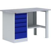 Внимание! Пожалуйста, проверяйте цвет изделия до начала сборки! Цвет на изображении товара в интернет-магазине или в печатном каталоге может отличаться от оригинала из-за особенностей цветопередачи. Верстак с одной тумбой предназначен для рациональной организации рабочего места мастерской или производственного помещения. Можно использовать для хранения различных деталей, инструментов и материалов. Надежное качество всех узлов и креплений обеспечивает долгий срок эксплуатации. Верстак может комплектоваться перфорированным экраном соответствующего размера с возможностью крепления крючков и держателей для инструмента. Верстак состоит из отдельных модулей: столешница, стенка задняя, верстачная опора, тумба (5 выдвижных ящиков, запираются общим ключевым замком), полка верстачная. Тип материала — металл. Тип материала столешницы — МДФ и оцинкованный лист металлический толщиной 1,5 мм. Максимальная нагрузка на столешницу — 300 кг. Нагрузка на верстачную полку — до 40 кг. Нагрузка на ящики — 30 кг. Количество замков — 1 (ключевой). Тип покрытия металлических элементов — порошковое. Конструкция сборная и все элементы поставляются в отдельной упаковке. Верстак легко собирается и имеет все необходимые комплектующие. Данный верстак можно доукомплектовать дополнительным оборудованием (арт. 355275, 1744044, 1744043, 355281, 355282, 1744045, 1744046). Законодательные и технические документы