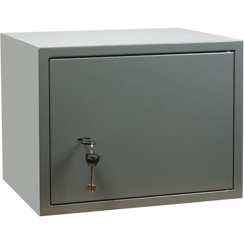 Шкаф для хранения бумаг, папок, печатей и других важных ценных вещей. Надежный механический замок с тремя ригелями, имеет съемную полку, отверстия для крепления к полу и стене. В комплекте 2 ключа. Порошковая изностойкая покраска серого цвета.