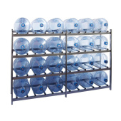 Стеллаж для бутилированной воды Бомис-24. Предназначен для организации хранения бутилированной воды в офисе, дома, на складе на минимальной площади. Полки стеллажа имеют оптимальный угол наклона, для удобства размещения и извлечения бутылей. Стеллаж оборудован подпятниками, что позволяет избежать повреждения напольного покрытия при его перемещении. Основание стеллажа не замкнуто, что удобно для уборки пола. Стеллаж имеет порошковое покрытие цвета металлик, устойчивое к истиранию. Толщина труб из стали равна 1,5 мм. Нагрузка на полку до 180 кг. Нагрузка на стеллаж до 528 кг.