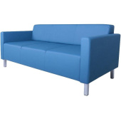 Диван Евро трехместный обтянут искусственной кожей синего цвета. Диван имеет ширину 1730 мм, глубину 770 мм и высоту 700 мм. Установлен на широких устойчивых опорах, изготовленных из нержавеющей стали с порошковой окраской серебристого цвета. Подлокотники и диванные подушки имеют прямоугольную форму с округлыми углами. Поверхность дивана моется с помощью специальных чистящих средств. Габариты посадочного места (ШxГ): 1530×550 мм. Ширина подлокотника 100 мм. Высота подлокотника от пола 600 мм. Высота спинки посадочного места 280 мм. Материал опор из металла, высота 150 мм. Высота сиденья 430 мм.