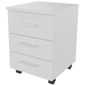 Тумба подкатная Steel 19300 с центральным замком. Вертикальные элементы и нижний топ каркаса тумбы из ЛДСП толщиной 16 мм с кромкой ПВХ — 0,4 мм, верхняя крышка из ЛДСП толщиной 25 мм с кромкой ПВХ — 2 мм. Три выдвижных ящика с внутренними размерами 330×380×90 мм, оборудованы шариковыми направляющими полного выдвижения и центральным замком. Ключ в пластиковой оправе. Фасады ящиков толщиной 16 мм. Ручки — пластиковые в форме прямоугольной скобы, цвет — хром матовый. Колесные опоры — пластиковые на стальных основаниях. -