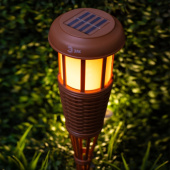 Светильник садовый на солнечной батарее Эра Факел бамбук 90 см жёлтый свет (Б0053383) Садовый светильник в виде факела высотой 90 см выполнен из пластика с имитацией бамбуковой конструкции. Устройство оснащено одной светодиодной лампой с тёплым жёлтым свечением, создающим визуальный эффект живого пламени. Светильник работает на солнечной батарее, автоматически заряжается днём и включается в тёмное время суток. Благодаря степени защиты IP44, изделие подходит для уличного использования и устойчиво к влаге и пыли. Лёгкая конструкция и эргономичная упаковка обеспечивают удобство транспортировки и установки. Элемент питания (солнечная батарея) в комплекте.