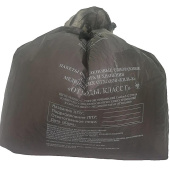 Пакет полиэтиленовый для сбора, хранения и утилизации медицинских отходов, одноразовый. Изделие насыщенного непрозрачного черного цвета (класс Г) изготовлено из полимерной пленки высшей категории качества, имеет толщину пленки не менее 18 микрон (не путем сложения), длину не менее 500 мм, ширину не менее 600 мм. При изготовлении должно быть предусмотрено добавление присадок, предотвращающих слипание стенок готового изделия, что необходимо для облегчения его подготовки к эксплуатации. На поверхности изделия должно быть наличие следующей маркировки: информационное окно с графами для заполнения (размером 23×23 см) с ярко выраженным четко читаемым (2 см) сведения о текущем классе опасности отходов; логотип и контактные данные производителя. Маркировка должна быть нанесена черной, нестирающейся при тактильном контакте краской строго посередине изделия. Наличие боковых складок не обязательно. Свойства: в случае прокола, пореза, изделие не должно расходиться, а должно сохранять свою целостность по всей поверхности. Общий объем изделия не более 30 литров. По дну изделия проходит сварной шов, шириной от 1,0 до 1,5 мм, он должен быть ровным, без пропусков, прожженных мест и складок.
