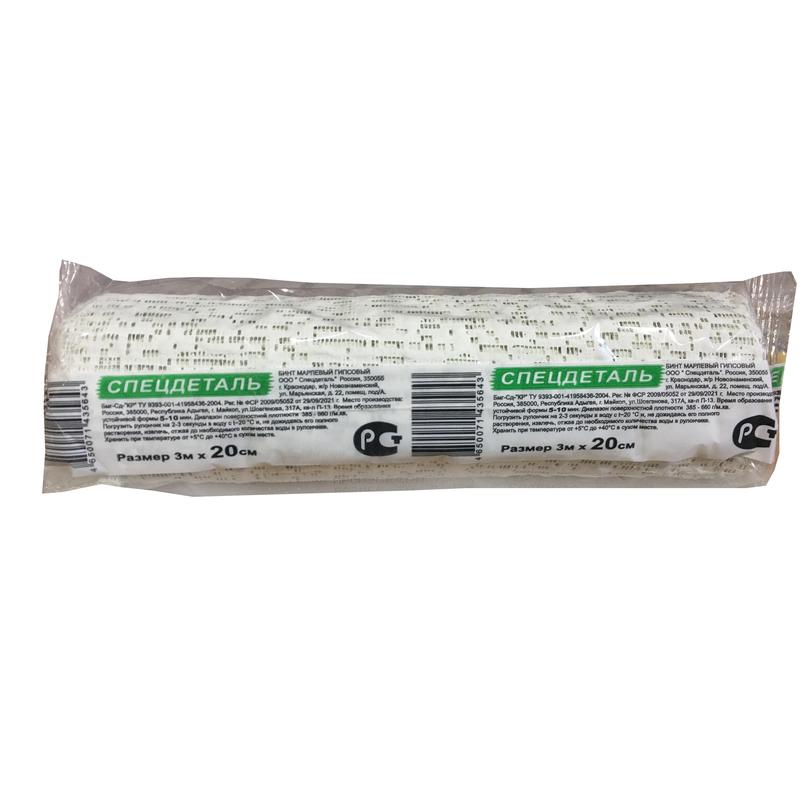 Бинт гипсовый марлевый медицинский с пластификатором — предназначен для наложения внешних шин, гипсовых повязок при переломах, для изготовления лангет, иммобилизации при лечении болезней костей и суставов, при травмах мягких тканей и в других случаях, когда требуется наложение фиксирующей гипсовой повязки, а также для изготовления слепков конечностей в ортопедии. Представляет собой полосы марли с зафиксированным с помощью бактериостатического и индифферентного к организму пластификатора медицинским гипсом, которые свернуты в рулончики и герметично упакованы в полиэтиленовую пленку по одному бинту в пакете. На каждом пакете нанесен трафарет с указанием инструкции по применению, условием и сроком хранения продукции. Фактическая плотность бинтов 450–550 г/кв.м при нормальной плотности марли 24–25 г/кв.м. Бинт классифицируется по времени образования устойчивой формы 5–10 минут.