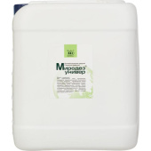 Дезинфицирующее средство «Миродез Универ» 5 л (концентрат). Химический состав дезсредства: ЧАС, альдегид, вспомогательные компоненты. Действующие вещества: алкилдиметилбензиламмоний хлорид (АДБАХ) + дидецилдиметиламмоний хлорид 12%, глиоксаль 5.7%, вспомогательные компоненты. Сфера применения: ЛПУ, клинические лаборатории, станции переливания крови, бактериологические лаборатории, инфекционные очаги, предприятия общественного питания, предприятия продовольственной торговли, потребительские рынки, коммунальные объекты (бани, бассейны, гостиницы, общественные туалеты и т. п.), учреждения соцобеспечения, парикмахерские, косметические и (или) массажные салоны, прачечные, санитарный транспорт, отделения неонатологии, предприятия фармацевтической промышленности, учреждения культуры, отдыха (кинотеатры, музеи, театры), спортивные и культурно-оздоровительные комплексы, диагностические лаборатории. Объекты обработки: белье нательное, белье постельное, вращающиеся стоматологические инструменты, выделения больного (моча, фекалии, мокрота), гибкие эндоскопы, жесткая мебель, жесткие эндоскопы, игрушки, ИМН из металлов, резин на основе натурального и силиконового каучука, стекла, пластмасс, ИМН обычные, ИМН одноразовые перед утилизацией, инструменты к эндоскопам, инструменты стоматологические, инструменты хирургические, кровь, лабораторная посуда, медицинские отходы из текстильных материалов (ватные и марлевые тампоны, марля, бинты), мокрота, моча, мусороуборочное оборудование, мусоропроводы, обувь из пластика, резины, одноразовая посуда, пищевые отходы, поверхности в помещениях, поверхности приборов и аппаратов, предметы для мытья посуды, предметы личной гигиены, предметы ухода за больными, рвотные массы, резиновые и полипропиленовые коврики, санитарно-техническое оборудование, санитарный транспорт, слюноотсосы, столовая посуда, стоматологические материалы (оттиски из альгината, силикона, полиэфирной смолы, зубопротезные заготовки, артикуляторы), транспорт для перевозки пищевых продуктов, уборочный инвентарь, фекалии. Основные режимы применения средства (концентрация/время): дезинфекция поверхностей по бактериям, исключая туберкулез (0.01%/120 мин., 0.05%/60 мин., 0.1%/30 мин., 0.2%/15 мин., 0.5%/5 мин.), дезинфекция поверхностей по вирусным инфекциям (0.1%/60 мин., 0.25%/30 мин., 0.5%/15 мин.), дезинфекция поверхностей по кандидозу (0.1%/60 мин., 0.25%/30 мин., 0.5%/15 мин.), дезинфекция поверхностей по дерматофитам (0.1%/60 мин., 0.25%/30 мин., 0.5%/15 мин.), дезинфекция поверхностей по туберкулезу (0.5%/60 мин., 1%/30 мин.), дезинфекция ИМН при бактериальных, вирусных инфекциях и кандидозе (0.2%/60 мин., 0.4%/30 мин.), дезинфекция, совмещенная с ПСО ИМН при бактериальных, вирусных инфекциях и кандидозе (0.2%/60 мин., 0.4%/30 мин.), дезинфекция крови (0.5%/90 мин., 1%/60 мин., 2%/30 мин.), дезинфекция мокроты (0.5%/90 мин., 1%/60 мин., 2%/30 мин.), дезинфекция фекалий (0.5%/90 мин., 1%/60 мин., 2%/30 мин.). Класс опасности: при введении в желудок — 3; при нанесении на кожу — 4; рабочего раствора — 4. Активно в отношении: бактерии (Mycobacterium tuberculosi, грамотрицательные бактерии, грамположительные бактерии), вирусы (аденовирусы, атипичной пневмонии, ВИЧ, герпеса, грипп, парагрипп, парентеральных гепатитов, полиомиелит, прочие возбудители ОРВИ, птичьего гриппа (H5N1), ротавирусы, энтеральных гепатитов, энтеровирусы), патогенные грибы (дерматофитон, кандида, 