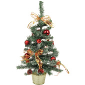 Новогодняя ель компактных размеров, красивая, декорирована в красной гамме бантиками, шарами, ягодами и шишками. Устойчиво стоит в подставке.