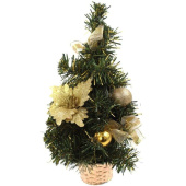 Елка новогодняя настольная конусного типа с украшениями из текстильных материалов золотистого цвета (бант, цветы, шары) не имеет ствола. Хвоя из ПВХ зеленого цвета с блестками накручена на металлическую спираль. Подставка — корзина из пластика. Высота 30 см. Упаковка — пакет.