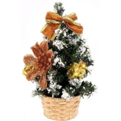 Елка новогодняя Remeco Collection настольная 20 см с декором (237284). Искусственная елка новогодняя настольная с украшениями из текстильных и полимерных материалов золотистого цвета (бант, цветы, презенты), не имеет ствола. Хвоя из ПВХ зеленого цвета с искусственным снегом накручена на металлическую спираль. Подставка — корзина из пластика. Высота 20 см. Упаковка — пакет.