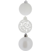 Набор шаров Remeco Collection Трио фэнтези пластик белые (диаметр 8 см, 3 штуки в упаковке). Набор из 3-х елочных шаров, диаметром 8 см, выполнен в единой цветовой гамме. В составе набора — пластиковые шары разной фактуры — глянцевые, с глиттером и ажурные. Прекрасно смотрятся в убранстве новогодней ели. Крепятся с помощью петли из ленты/нити. Поставляются в прозрачной пластиковой упаковке.