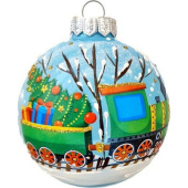 Елочное украшение в виде шара с нанесенным рисунком «Паровоз с вагончиком» в индивидуальной подарочной упаковке.