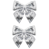 Новогоднее украшение Magic Time Бант текстиль серебристое. Бант — одна из традиционных разновидностей украшения для новогодней ели. Банты придают елке большую пышность, помогают заполнить промежутки между игрушками и дополняют другой декор. Банты также широко применяются в качестве оформления для интерьера, ведь закрепить их можно практически на любую поверхность. Набор состоит из 2 бантов. Размер каждого банта: 14×12 см. Материал: полиэстер.