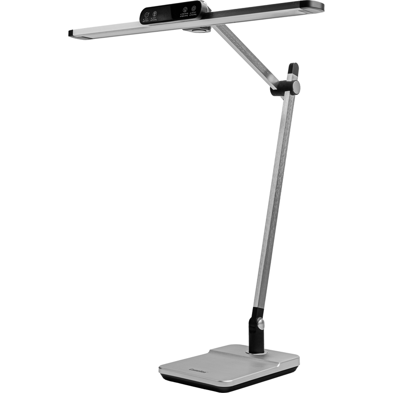 Светильник настольный Camelion KD-878 C03 серебристый Светодиодный светильник премиального качества. Идеален для освещения любых рабочих мест, особенно оснащенных большими мониторами. Мощность светильника 12 Вт ( 230В, 50Гц/ 12В. Регулировка яркости, макс. Яркость 770 лм, 3 режима цветовой температуры: 3000К- 4000К- 6500К. Великолепные световые характеристики- Индекс цветопередачи Ra>90, расположение светодиодов по периметру плафона и специальный рассеиватель плафона дают мягкий и комфортный для глаз свет. Светильник устанавливается на горизонтальную поверхность стола, имеет мощное устойчивое прямоугольное пластиковое основание ( 20 см Х 15 см) с обработкой и покраской «под металл» . 2-звенная стойка (звенья- 47 см и 25 см) изготовлена из алюминия. Алюминиевый плафон имеет прямоугольную форму (50 см Х4,5 см) с декоративными черными пластиковыми элементами в торцах. Управление светильником — сенсорное. Кнопки управления находятся на дисплее светильника (на центральной части плафона). Дисплей оснащен электронными часами с возможностью демонстрации времени в 12- и 24-часовом форматах. Светильник имеет таймер −15, 30 и 45 минут со световыми сигналами после остановки таймера, и режим отключения через 90 секунд. Диапазон высот плафона над уровнем стола в рабочем положении ( плафон находится параллельно поверхности стола: минимальная высота — 23 см и максимальная высота — 59 см. Внешний вид и/или характеристики товара могут быть изменены производителем в соответствии с производственным процессом.