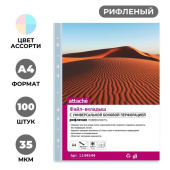 В рамках обновления дизайна упаковки с сохранением всех потребительских характеристик товара, допускается поставка данной продукции в двух вариантах дизайна упаковки.Файл-вкладыш ассорти Attache формата А4, предназначенный для хранения и защиты печатных документов. Поверхность рифленая. Позволяет копировать документы, не вынимая их из папки. Изготовлен из полипропиленовой пленки (толщина 35 мкм). Боковая перфорация подходит для разных типов скоросшивателей. В упаковке содержится 100 файлов, по 25 штук каждого цвета: зеленый, красный, желтый, синий. Каждыйфайл-вкладыш вмещает около 40 листов стандартной плотности. Нанесение логотипа возможно только на перфорации, на самом файле нет. -