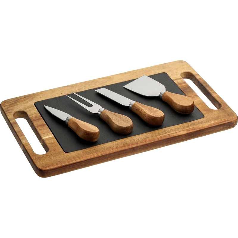 Набор для сыра Тильзитер (6 предметов в наборе, 10604). В наборе 6 предметов: — доска для подачи из сланца; — деревянный поднос для сервировки; — вилка для сыра; — нож-лопатка для мягкого сыра; — нож-топорик для твёрдых сыров; — листовидный нож для сыра твёрдых сортов. Сланец — экологически чистый камень, который совершенно безопасен при контакте с пищей, отличается износостойкостью и не впитывает влагу. Поднос и рукоятки ножей выполнены из дерева акации, лезвия — из высококачественной нержавеющей стали. Поставляется в белой транспортной коробке.